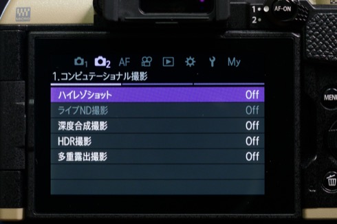 他にも電子シャッターで連写して合成する系の機能としては、手持ち夜景、比較明合成を行う「ライブコンポジット」や、リアルタイムで写りを確認しながら撮れる「ライブバルブ」撮影がある。