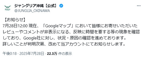 これについて、ジャングリア沖縄はXで声明を発表。「Google マップにおいて皆さまにお寄せいただいたレビューやコメントが非表示になる、反映に時間を要するなどの現象を確認しており、Google社に対し、状況・原因の確認を進めております」と説明。同施設側も口コミが消えた原因は把握できていないと述べている。