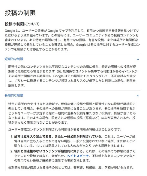 なおGoogle マップのヘルプページでは、Google側が投稿を制限する場合についての項目がある。これによると「関連性の低いコンテンツまたは不適切なコンテンツの急増に備え、特定の場所への投稿が短期的に無効になる場合がある」と記載がある。