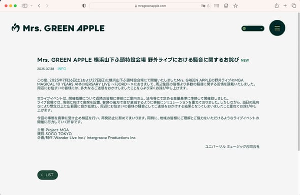 人気アーティストのMrs.GREEN APPLEが7月26日と27日に開催した野外ライブの騒音問題で、主催者側は7月28日夜に謝罪した。「検証を行い、再発防止に努める」としている。