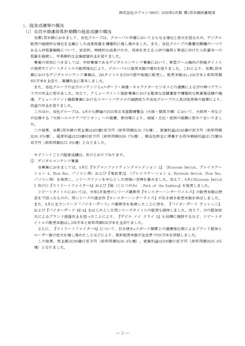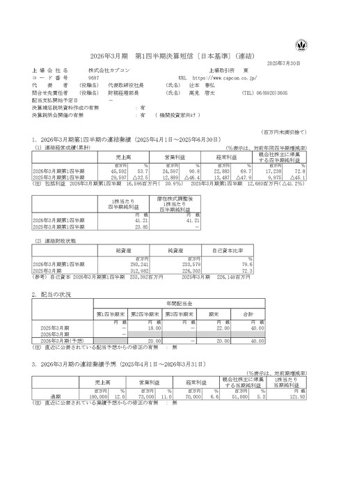 カプコンは7月30日、2026年3月期第1四半期(2025年4月1日〜6月30日)の連結業績を発表した。売上高は455億200万円(前年同期比53.7%増)、営業利益は245億9700万円(同90.8%増)、経常利益は228億8300万円(同69.7%増)、純利益は172億3800万円(同72.8%増)となった。