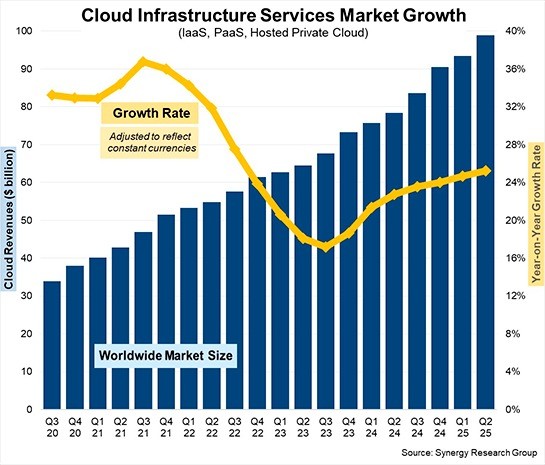 調査会社の米Synergy Research Groupは、グローバルにおける2025年第2四半期のクラウドインフラの市場状況について調査結果を発表しました。