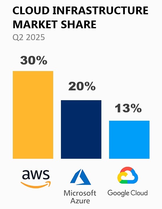 クラウドインフラのシェア、AWSがついに30%を切る Azureは22%と成長 2025年第1四半期、Synergy Researchの調査結果