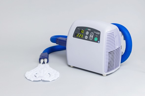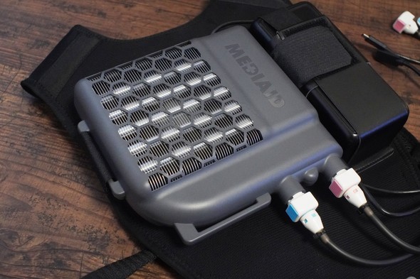 これには元々同社が、医療機器として冷却療法装置「アイシングシステム」を開発していたという経緯がある。これはケガや手術後の患部を冷却して回復を早めるという装置で、冷却パッドは関節部などどこにでもフィットするよう設計されている。初号機は1997年に登場しており、23年には新モデルが出ているという、今なお医療の最前線で活躍する装置だ。この装置も、タンクレスではないものの、特殊冷却水をペルチェで冷やして循環させるという構造をとっている。つまり、ペルチェ水冷で人体を冷やす元祖がこれ、ということになる。