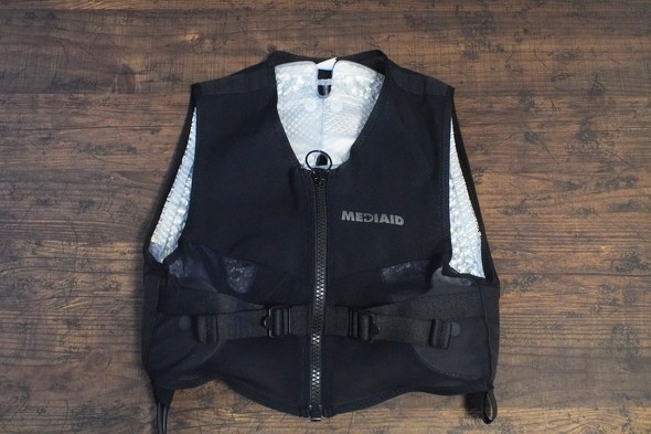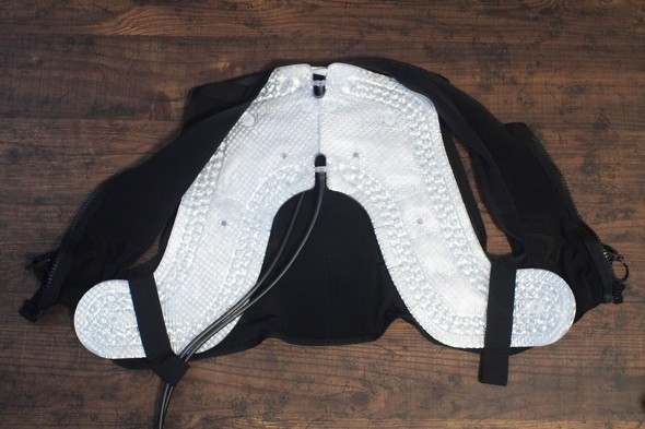 まずインナーとも言える冷却部から見ていこう。内側に循環シートを配したベスト状になっており、ベスト自体は伸縮性のある素材でできている。このあたりは同社が長年取り組んでいるサポーターなどの技術が生きている。最初にファスナーを閉めるときは若干きつめの気がするが、ベスト全体で密着してくるので、ベルトで留めている感が少ない。