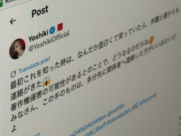 アニメ「ダンダダン」第18話の“お囃子(はやし)”シーンに著作権侵害の可能性が浮上した。ロックグループ、X JAPANのリーダーであるYoshikiさん(@YoshikiOfficial)が8日、X上で指摘した。