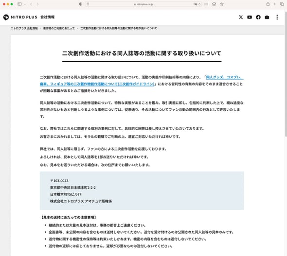 ニトロプラスは8月18日、同人誌など二次創作活動について、過度な営利性がないと判断できればファン活動として許容すると表明した。同人誌は見本として1部送ってほしいとしている。