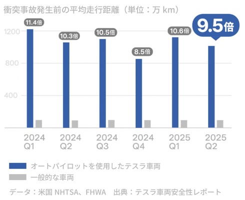 Tesla Japanは「一般的な車の場合、米国では平均113万km毎に1件の衝突事故が発生している。テスラのオートパイロット機能をオンにした車両は平均1077万km毎に1件の衝突事故しか発生していない」と説明。続けて「全ての事故を防ぐことができる車はまだ存在しないが、テスラは事故をできる限り少なくできるよう日々努力をしている」と述べている。