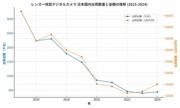 カメラ映像機器工業会の公開資料によれば、国内向けのレンズ一体型カメラの出荷台数は23年に底を打ち、22年ごろの水準に復調したように見える。一方金額ベースでみれば、台数よりも金額のほうがより大きく復調しており、20年の水準に戻しているのがわかる。