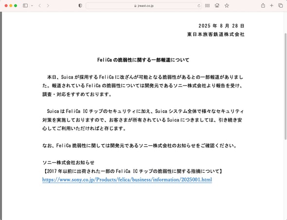 交通系ICカードなどに使われる非接触型IC技術「FeliCa(フェリカ)」のICチップに脆弱性があると指摘された件で8月28日、開発元のソニーや「Suica」に同チップを採用したJR東日本、「iD」のNTTドコモなどが相次ぎ「引き続き安心して使える」旨の声明を発表した。