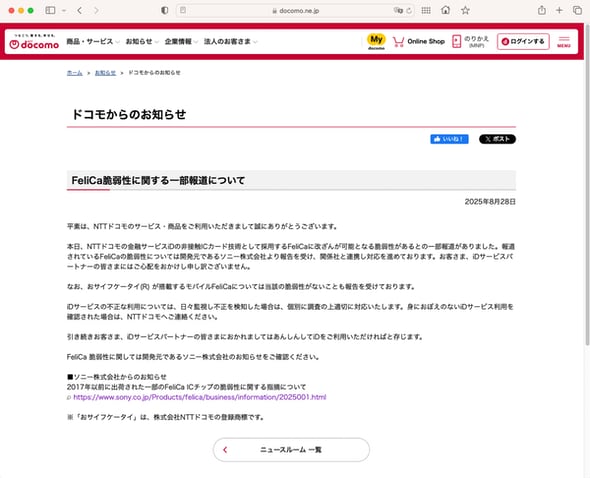JR東日本もソニーと同じ内容の声明を出した他、NTTドコモは「iDサービスの不正な利用については、日々監視し不正を検知した場合は、個別に調査の上適切に対応する」と自社サービスのセキュリティを説明。引き続き安心してiDを使えるとしている。併せて「おサイフケータイ」が搭載する「モバイルFeliCa」には当該の脆弱性はないことも報告した。