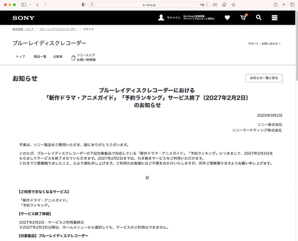 ソニーは9月2日、Blu-ray Discレコーダーで提供していた「新作ドラマ・アニメガイド」および「予約ランキング」のサービスを、2027年2月2日をもって終了すると発表した。理由は明らかにしていない。