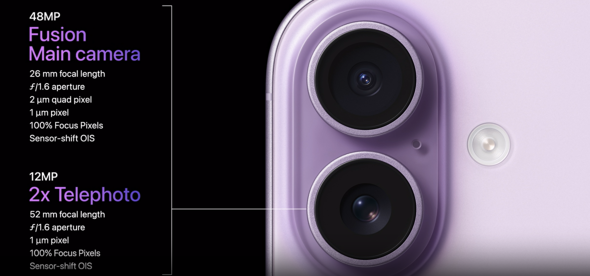6.3インチの有機ELディスプレイを搭載。チップは6コアCPUと5コアGPUを備えた「A19」チップを採用した。これにより「A18」を搭載したiPhone 16に比べ20%の処理速度向上を実現したという。16コアのNeural Engineも強化し、同社のAI機能「Apple Intelligence」に対応する。