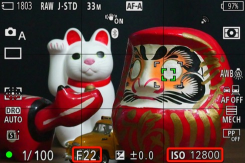F22にすると背景のボケがより小さくなって、後ろに何を置いているかがよりはっきりしたのだが、ISO感度がぐんと上がってしまった。ISO12800である。