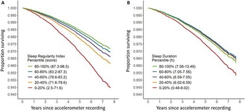最大7.8年の追跡期間中に1859人が死亡したが、睡眠が規則的な上位80%の人々は、最も不規則な下位20%と比較して、全死因死亡リスクが20〜48%低いことが判明した。