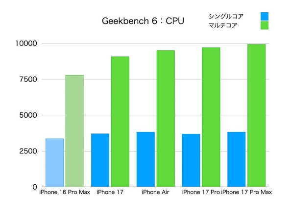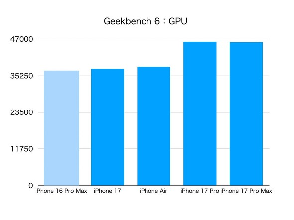 Geekbench 6でCPUとGPUのテストをしたが、全機種で昨年のフラッグシップモデルであるiPhone 16 Pro Maxを超えた。