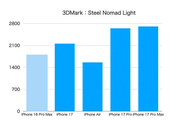 ゲームでの実性能に近い部分を3DMark(テストはStell Nomad Light)でチェックしたが、こちらの場合、GPUコアが多いiPhone 17 Proシリーズの結果が突出している。iPhone Airの値が低いのは、GPUコアが1つ少ないことに加え、発熱を抑えるために性能も抑えられているのだろう。