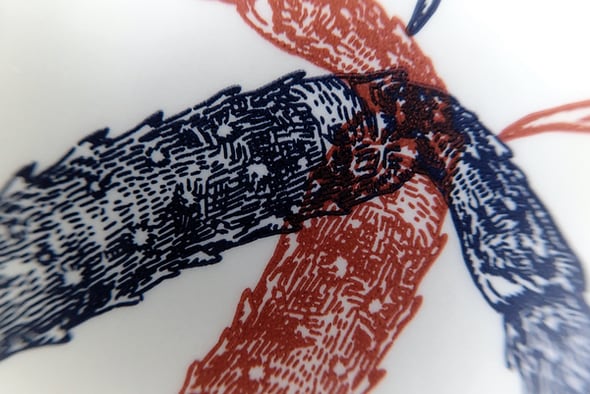 そう思って、ステッカーを見ると、例えば二色刷りの「タラバガニ」の、青の版と赤の版が重なっているところなど、いかにマエダ特殊印刷の版作り、インクの調整、機械の調整が繊細に行われているかが分かるような気がする。インクも手で練って作っているそうなので、版の重なり具合なども、しっかりとコントロールされているのだろう。
