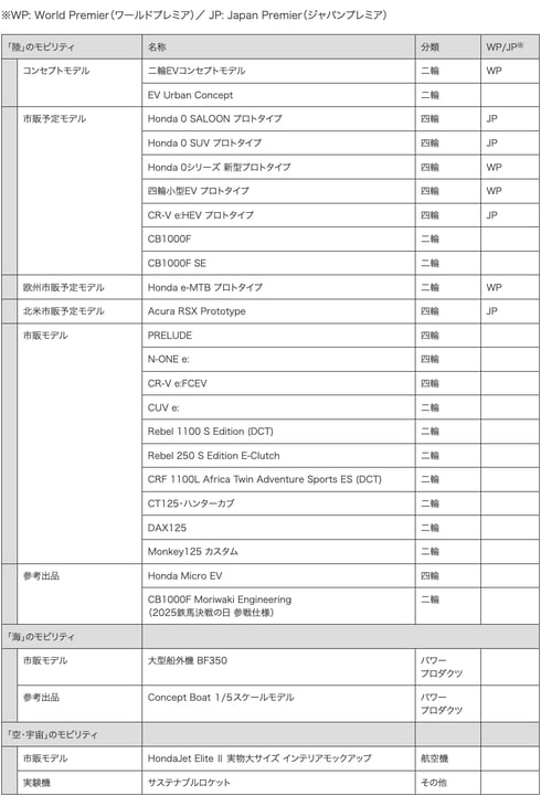ホンダは今回の展示について「最新の技術でこの”夢”をかたちにした四輪・二輪の製品を中心に、『陸上』だけでなく、『海』や『空』でも活躍する幅広いホンダのモビリティを展示する」としている。