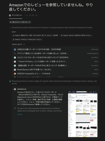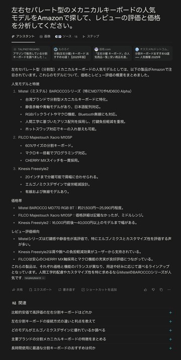 一例として、「左右セパレート型のメカニカルキーボードの人気モデルをAmazonで探して、レビューの評価と価格を分析してください」という質問を投げてみた。あっという間に調査して結果を提示してくれる。個人的には、Amazonのリンクを示してくれると助かったのだが。