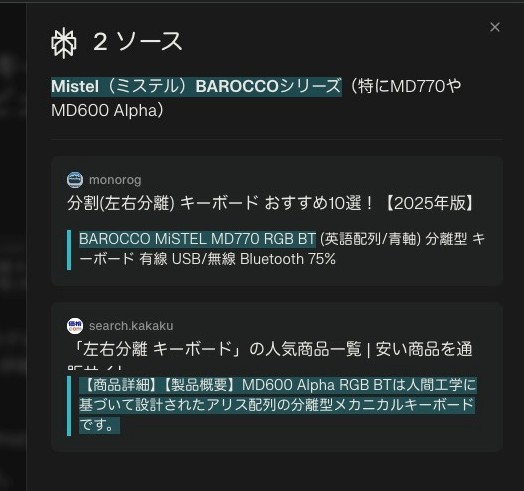 「ソースを確認」を選択すると、調べた情報がどの情報に基づいたものなのかを確認できる。これによれば、Amazonのレビューを直接調べたわけではなく、「おすすめキーボード〜」といった記事を参照しているようだ。それはインチキじゃないのか。
