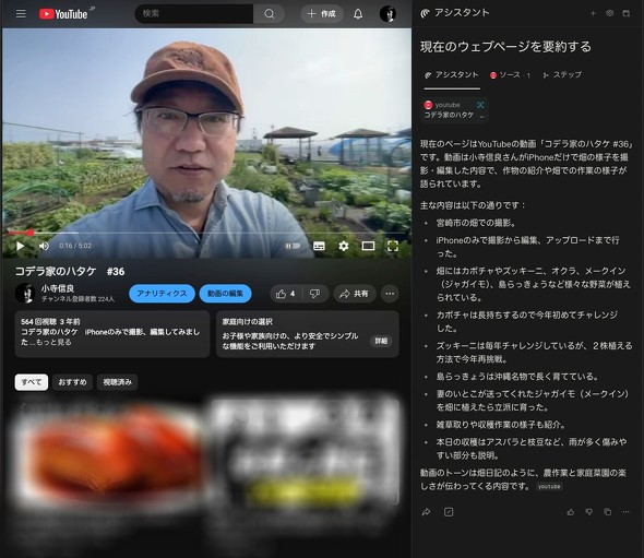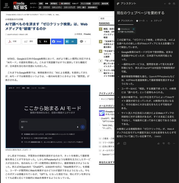 どうにかサイトにたどり着けば、そこの表示は普通のブラウザと同じである。だがそこからがCometの本領発揮だ。上部ツールバーの「現在のウェブページを要約する」アイコンをクリックすると、右側にアシスタントページが開いて、そのページの要約が表示される。