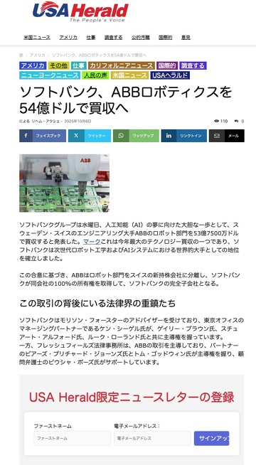ただ、見出しやサマリーに日本語としておかしい箇所が散見される。例えば日本企業に関するニュースとして、ソフトバンクグループによるスイスABBのロボティクス部門買収のニュースを取り上げてみる。