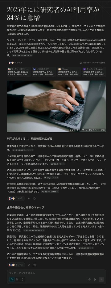 もう1つサンプルとして、「2025年には研究者のAI利用率が84%に急増」という見出しのサマリーを見ていく。こちらはMac版でも比較的誤訳が少なく、意味が通る文章になっている。