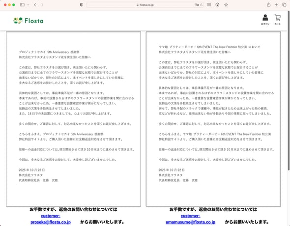 “推し活”向けのスタンド花──いわゆるフラワースタンドを手掛けるフラスタ(東京都中央区)は10月22日、自社サイトのトップページに2つの謝罪文を掲載した。10月18日と19日に行われた2つのイベントに向けて参加者が発注したフラワースタンドの多くに不備があり、SNSなどで炎上していた。