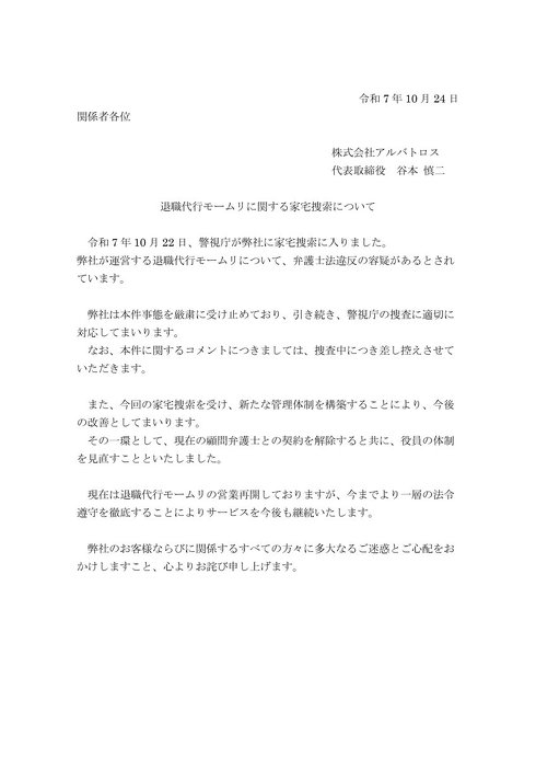 退職代行サービス「モームリ」を展開するアルバトロス(東京都品川区)は10月24日、22日に警察庁の家宅捜索が入ったことについて声明を発表した。詳細なコメントは捜査中のため差し控えるとしつつ、新たな管理体制を構築して改善していくと表明した。