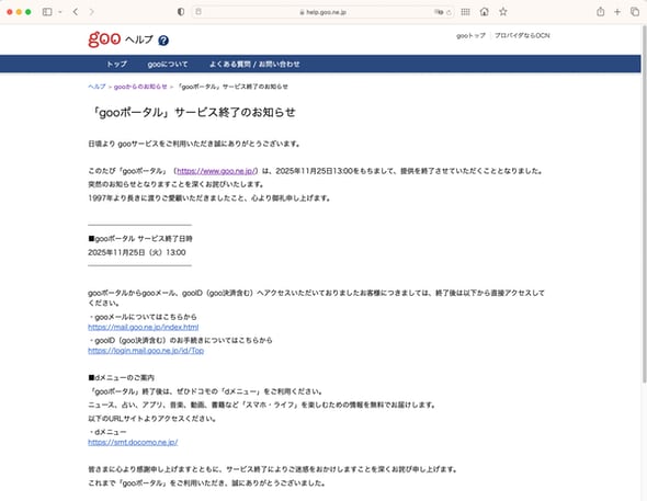 NTTドコモは10月24日、「gooポータル」と「いまトピ」のサービスを11月25日午後1時に終了すると発表した。1997年からサービスを提供してきたgooポータルは、28年の歴史に幕を下ろす。