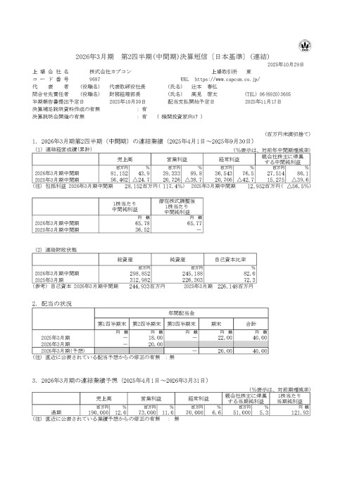 なお、カプコンの26年3月期第2四半期の決算結果は、売り上げが811億5200万円(前年同期比43.9%増)、営業利益は393億3300万円(同89.8%増)、純利益は275億1400万円(同80.1%増)という結果だった。