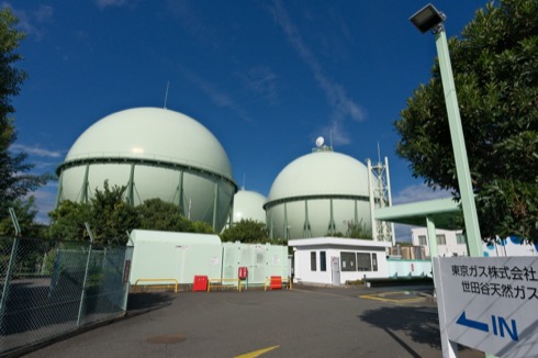 オートモードでガスタンクにレンズを向けると風景/青空と認識され、空の青がより鮮やかに出た。普段のガスタンク作例より広角なのは13-30mmの広角端を使ったため。
