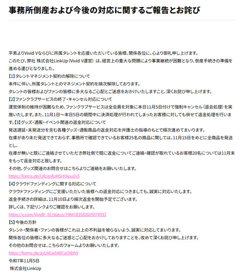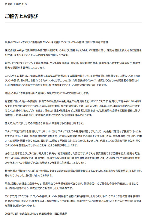 VTuber事務所「Vivid V」を経営していたLinkUp(東京都千代田区)は11月5日、倒産手続きを始めると発表した。同社の西口昇太朗代表が会社資金の私的流用を繰り返し、会社の資金繰りを圧迫したことなどが原因。倒産を受け、所属タレントのマネジメント契約も順次解除していく。