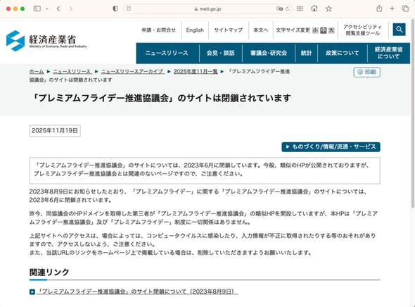 当時、情報発信を担当したのが、16年度に官民連携で設立した「プレミアムフライデー推進協議会」だった。しかしWebサイトは22年10月に更新を止め、23年6月1日に閉鎖した。同年8月のドメイン有効期限切れ直前にITmedia NEWSが経産省にドメン管理方針を聞いたところ「調整中。確定した情報を伝えることはできない」としていた(23年8月2日の記事より)。