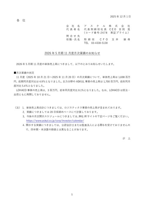 アスクルは12月1日、2026年5月期11月度(25年10月21日〜11月20日)の月次業績を発表した。単体売上高は16億9800万円という結果に。25年5月期11月度(24年10月21日〜11月20日)の単体売上高343億9900万円だったため、前年同月度比で4.9%の大幅減となった。
