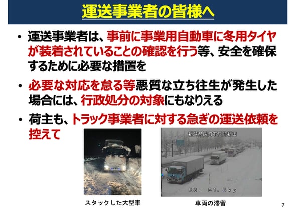 高速道路などでは、クルマの立ち往生を防ぐ「予防的通行止め」を行うこともある。その際、高速道路と国道が同時に通行止めになることもあり、運送業者に対しては「国土交通省防災ポータル」などを活用して最新情報に注意することに加え、広域迂回や通行ルート見直しなども求めている。