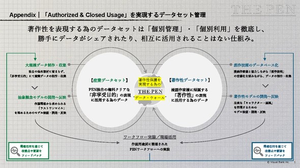 その核心は、データの管理方法にある。THE PENは、作家個人の絵柄を再現するための「著作性データセット」と、作画の基礎となる一般的な概念を学習した「産業データセット」を分離。両者の間には「データ・ウォール」と呼ばれる壁を設け、作家Aの著作性データが作家Bの作画支援に利用されたり、産業データセットと不必要に混ざったりすることがない仕組みを構築しているという。