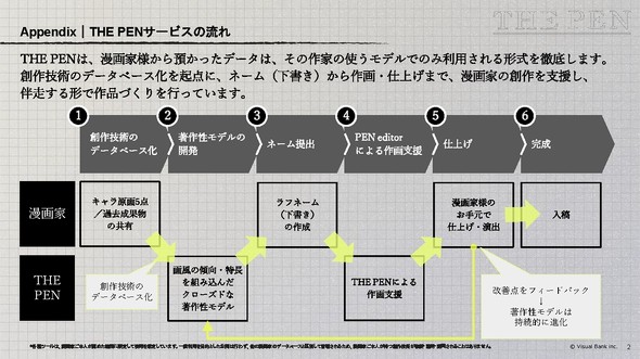ある60代のベテラン漫画家は、このアプローチを採用したTHE PENにより隔週連載約20ページの執筆時間が従来の約4分の1に短縮されたという。また別の作家は、「AIがバランス良く安定した線を出してくれる。そこから、いかに外すか、崩すか、みたいな作業で、より場面や感情にあった演出表現に力を入れられる」ようになったという。