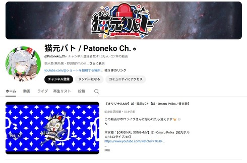 猫元パトさんは、20年4月に「クソゲーパトロール猫」という名称で活動を始めた、企業に所属しない個人勢のVTuber。その後23年8月に、現在の猫元パトの名称に改め、活動を続けている。12月11日現在、YouTubeチャンネルの登録者数は41.8万人に及んでいる。