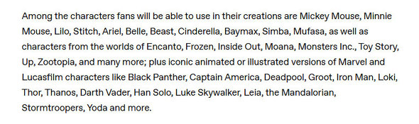 対象キャラクターにはミッキーマウス、ミニーマウス、リロ、スティッチ、アリエル、シンデレラ、ベイマックス、シンバといったDisneyキャラクターに加え、アイアンマン、キャプテン・アメリカ、デッドプール、ダース・ベイダー、ハン・ソロ、ルーク・スカイウォーカー、レイア、ヨーダなどMarvelとLucasfilmのキャラクターが含まれる。衣装、小道具、乗り物、象徴的な環境も利用可能だ。