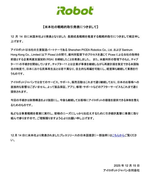 米iRobotのチャプター11申請を受け、日本法人のアイロボットジャパンは12月15日、声明を発表した。日本での販売活動やサービス、サポートなどはこれまで通り継続するため、ユーザーに直接的な影響はないという。