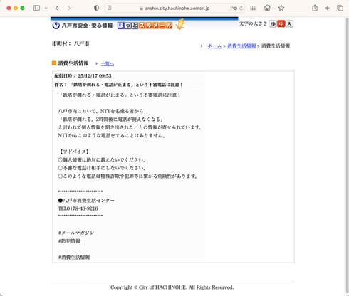 電話は「鉄塔が倒れる。2時間後に電話が使えなくなる」などと虚偽の情報を伝え、個人情報を聞き出す。八戸市は「NTTからこのような電話をすることはない」として個人情報を伝えないように呼びかけている。