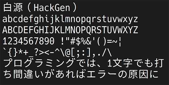 白源 (はくげん/HackGen)は、プログラミング向け欧文フォント「Hack」と、アドビの日本語フォント「源ノ角ゴシック」の派生フォント「源柔ゴシック」を合成したフォントです。さらに下記の視認性向上などが行われています。