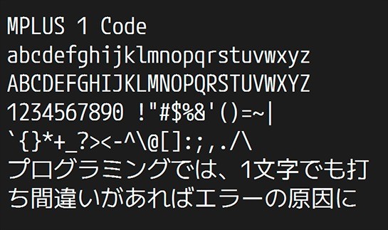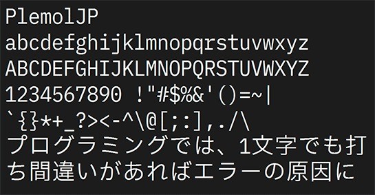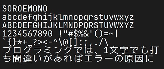 コードを表示させたときに整然として見やすく、エディタ上でカーソルを上下に移動させてもカーソル位置が左右にぶれずに表示されるように文字の幅が等幅に揃っていることも必要でしょう。