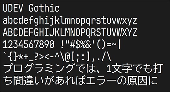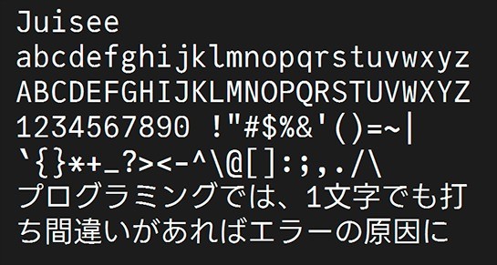 日本語の場合には、「−」(マイナス記号)と「ー」(音引き)の区別や、コード内に全角空白が紛れ込んだとしてもすぐに見分けられることなどの特徴を備えていることもプログラミングに適したフォントに求められる条件だといえます。