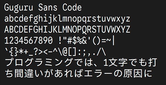 Guguru Sans Code は、Googleが作成した開発者向けフォント「Google Sans Code」とIBMが開発した日本語フォントの「IBM Plex Sans JP」を合成したプログラミング向けフォントです。