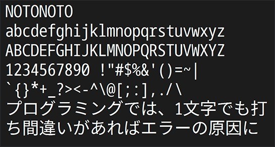 NOTONOTOは、すべての言語に対応したフォントを開発することで、いわゆる「豆腐」と呼ばれる四角い記号が現れることのないように「No Tofu」という意味を込めてGoogleが開発した等幅の欧文フォント「Noto Sans Mono」と、日本語フォントの「Noto Sans Japanese」を合成したフォントです。