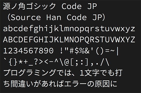 源ノ角ゴシック Code JPは、米Adobeがユーザーインターフェイスなどの用途向けにアルファベットや数字をディスプレイで判別しやすく作成した欧文の等幅フォント「Source Code Pro」と、AdobeとGoogleが協力して日本語と韓国語で用いる文字および中国語で用いる繁体字と簡体字のグリフのバリエーションすべてに完全に対応し、タブレットやスマートフォンなどの小型デバイスでも読みやすいシンプルなフォントとして作成した「源ノ角ゴシック(Source Han Sans)」とを組み合わせて調整されたフォントです。