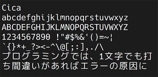 Cicaは、英数字と記号類にプログラミング向け欧文フォント「Hack」と「DejaVu Sans Mono」を、それ以外の文字にはゴシック体の日本語フォント「M+ OUTLINE FONTS」を丸ゴシック化した「自家製 Rounded M+ (ラウンデッド エムプラス)」などを利用して合成したフォントです。